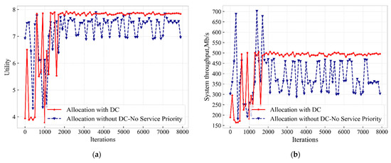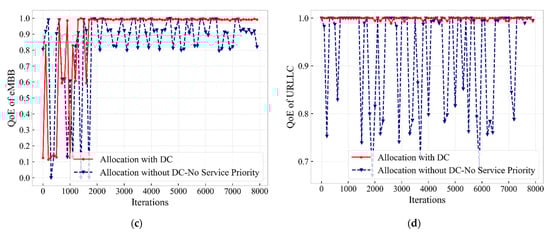 Figure 7 shows the comparison of various optimization objectives with and without DC assistance without service priority. From Figure 7a, it can be observed that there are still some points without DC assistance that can reach system utility under DC assistance after convergence. In fact, there is no additional system power consumption without DC assist. Therefore, the utility gap between both situations will be more pronounced if the system energy consumption is not considered. From Figure 7b, we can find that the peak throughput of the system without DC assistance is still about 40 Mb/s less than that with DC assistance after convergence. Figure 7c,d show that the QoEs of both eMBB and URLLC can reach 1.0, but the QoE curve is very unstable, and the QoE fluctuation of the URLLC service is larger than that of eMBB, which is even lower than 0.7. Overall, the value of each optimization objective with DC assistance is higher and more stable after convergence than without DC assistance.