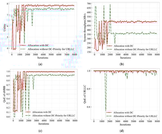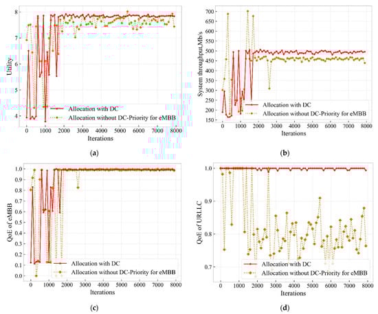 Figure 8 depicts the comparison of different optimization goals when the eMBB service priority is higher. Figure 8a shows that some strategies can achieve satisfactory values without DC assistance after convergence, and even the values of some points exceed those with DC assistance. From Figure 8b, it can be observed that when the eMBB service priority is higher without DC assistance, the system throughput is stable at about 450 Mb/s after the curve converges, which is 50 Mb/s lower than that with DC assistance. Figure 8c shows that the QoE of eMBB can also be stabilized to 1.0 when the eMBB service priority is higher without DC assistance. We can find from Figure 8d that when the eMBB service has a higher priority without the assistance of the DC, the QoE of the URLLC service after convergence is not as excellent as in the early iteration stage, because the rewards we set are more inclined to satisfy the QoE of eMBB service. In addition, when there is no DC assistance, only the QoE of the URLLC service can be sacrificed to meet the requirements of eMBB. We can also find that the QoE convergence curve trend of URLLC is very similar to the utility curve without DC assistance. This is because the throughput of the system and the QoE of eMBB are very stable after convergence, so the curve trend of QoE of URLLC determines the trend of the utility curve. Comparing Figure 8a,b, we can conclude that although the utility of the system without DC assistance has individual points that exceed the converged value with DC assistance, this is not the satisfactory result we want, because at this time, the QoE of the URLLC service is far lower than the service requirement. Furthermore, there is no additional system power consumption without DC assist. Therefore, the utility of the system without DC assistance cannot be higher than that of the system with DC assistance, if the system energy consumption is not considered.
