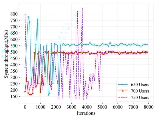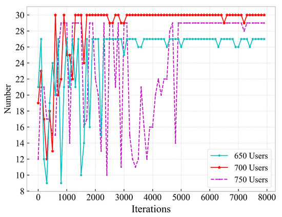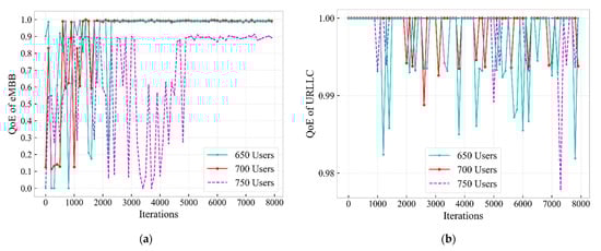 Figure 10, Figure 11, Figure 12 and Figure 13 depict the effects of different numbers of users within the network system on various optimization goals. Figure 10 clearly shows that when the number of users in the system is larger, its utility will be lower. In addition, when the number of users reaches 750, the convergence of the algorithm also becomes not very stable, and it does not really converge until about 5000 iterations. Figure 11 shows that the number of users using DC varies as the number of users in the system increases because the added users include users of both services. In the figure, when the number of users is 700, there are more users using DC than when the number of users is 750. Because our users are randomly distributed, although the number of users is 750, the number of users of the SBS may not be more than the case where the total number of users is 700. The convergence trend of the curve is similar to the utility; when the number of users is 750, there will be an unstable fluctuation after the training convergence. From the perspective of system throughput, when the number of users in the system is 700 and 750, the system throughput is almost equal, but both are smaller than the throughput when the number of users is 650. Figure 13a shows that when the number of users is 650 and 700, the QoE of eMBB service can reach 1.0, but when the total number of users is 750, the QoE of eMBB can only converge to about 0.9. From the QoE of URLLC service, due to the role of DC, even if the total number of users of the system reaches 750, its QoE can reach more than 0.97. As can be observed from Figure 10, Figure 11, Figure 12 and Figure 13, the number of users that the system can accommodate is between 700 and 750 under the condition that the QoE of the users can meet the requirements.