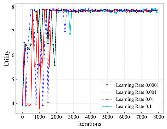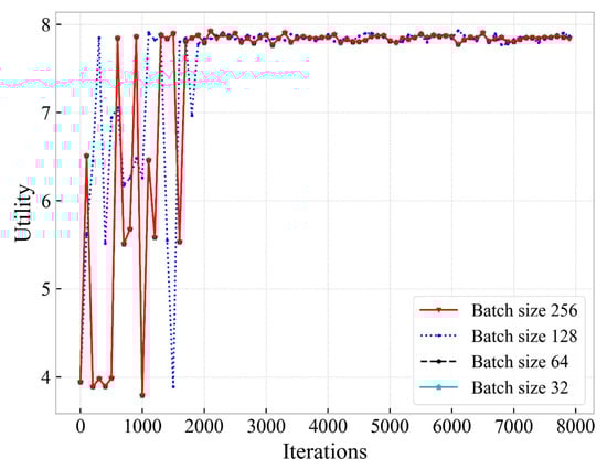 Figure 14 shows the effect of different learning rates on the performance of the algorithm. As can be observed from the figure, under different learning rates, our algorithm can converge to an optimal value. However, when the learning rate is different, the convergence speed of the curve is different. When the learning rate is 0.1, the convergence rate is the slowest, because the optimization gradient is very large in this case, and it is easy to skip the optimal solution. When the learning rate is 0.0001, the convergence speed is also very slow, because the gradient is too small, resulting in a slow optimization speed. When the learning rate is 0.001, the optimization gradient will not be too large, and the learning speed will not be very slow, so it has the fastest convergence rate. As can be observed from Figure 15, different batch sizes have little effect on the performance of our proposed algorithm, and even the optimization curves overlap. This is because more optimal actions appear in our environment due to dual connections, so, in most cases, the same training result will be obtained even if the batch size of each training is different.