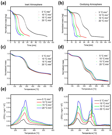 Thermal decomposition of cocoa shells in TG using different atmospheres and heating rates. (a,c) inert atmosphere; (b,d) oxidizing atmosphere. DTG curves (e) inert atmosphere; (f) oxidizing atmosphere.