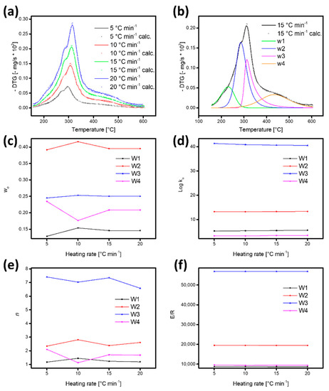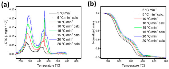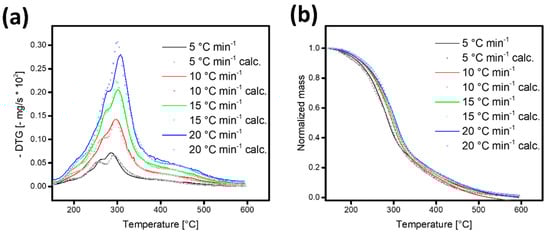Additionally, it has been considered to give a flexibility window of up to ±5 °C for each T obtained experimentally, so that the optimization process better adjusts each heating rate, considering this temperature dispersion that can be common in this type of experiments. In Equation (8), the value = 0.5 has been set as an arbitrary value (note that the maximum weight loss rate is close to the temperature where the remaining weight fraction is 0.5) to run the model and find the values of T, , and that minimize the error between the calculated and the experimental curves (objective-error function) of TG and DTG, calculated as follows: