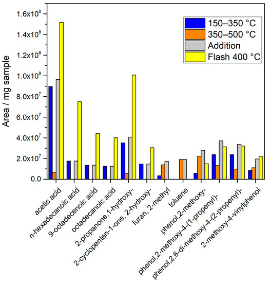 In Figure 5, it can be seen how flash pyrolysis at 400 °C significantly increases the yield of some compounds compared to pyrolysis at higher temperature (up to 500 °C when considering the sum of the 2 slow pyrolysis intervals) but lower heating rate. These compounds are organic acids and ketones, that is, compounds that come mainly from the thermal decomposition of hemicellulose and cellulose. They are compounds that in the slow pyrolysis at 350 °C had already been generated fairly completely and an additional pyrolysis up to 500 °C does not increase their yield significantly. However, an increase in heating rate does. Other compounds, such as furan,2-methyl and toluene, which had hardly formed in the 150–350 °C range, were also not detected in flash pyrolysis at 400 °C. In the case of the main phenolic derivatives, coming from the decomposition of lignin, the increase in the heating rate cannot improve the yield obtained in slow pyrolysis, but the yields achieved in flash pyrolysis at 400 °C have been very similar to those of slow pyrolysis up to 500 °C.