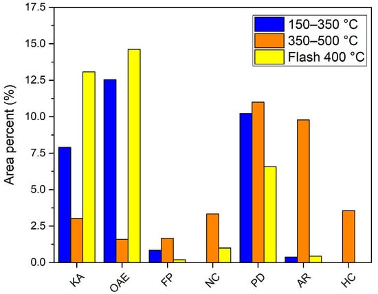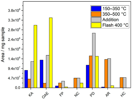 Figure 5 compares the area/mg sample of different compounds obtained in the 3 types of experiments. The addition of the results corresponding to 150–350 °C and 350–500 °C has been also included in the figure, in order to have a better comparison with the flash pyrolysis result.