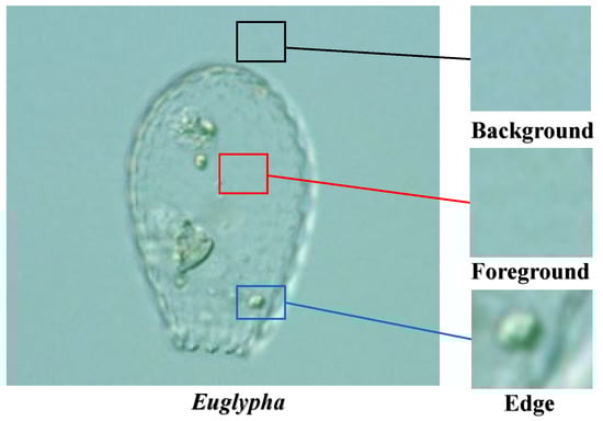 In recent years, deep learning has achieved a good performance in the field of computer vision. We consider the excellent performance of computer vision in image analysis [], such as its high speed, high accuracy, low consumption, high degree of quantification, and strong objectivity []. Additionally, compared with traditional manual methods, computer image analysis can reduce manual effort from time-consuming tasks. Consequently, computer vision-based approaches can overcome the limitations of traditional methods and demonstrate great potential for transparent image analyses []. Particularly, when the object is transparent or has low contrast in the image, more foreground information is required; therefore, more visual details are found to recover the lost information from patches or pixels. As shown in Figure 1, the foreground and background of microorganisms are similar. There is only a small amount of information on the edges; which makes it difficult for traditional convolutional neural network (CNN) algorithms to distinguish transparent objects in images globally []. To address this problem, it is necessary to analyze transparent images from patches. We cropped the image into fixed-size patches and created a deep learning network to learn the features of the visual information of foreground and background patches. The network trained in this manner is sensitive to the foreground and background, which helps to distinguish transparent objects and achieve segmentation.