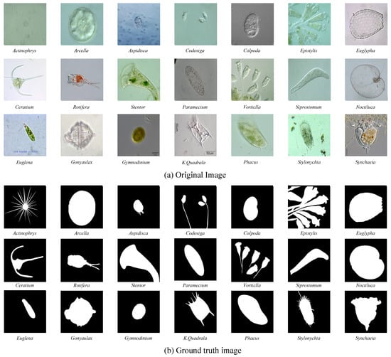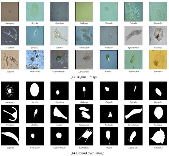 In this study, we used the environmental microorganism dataset fifth version (EMDS-5) as transparent images for the analysis []. The effectiveness and robustness of deep learning methods based on the small dataset, EMDS-5, are provided in detail in []. Table 1 shows the data distribution of EMDS-5 in the experiment. It is a newly released version of the EMDS series, which includes 21 types of EMs, each of which contains 20 original microscopic images and their corresponding ground-truth (GT) images (examples are shown in Figure 3). We randomly divided each category of the EMDS-5 into training, validation, and test datasets in a ratio of 1:1:2. Thus, we obtained 105 original images and their corresponding GT images for training and validation, respectively, and 210 original images for testing.