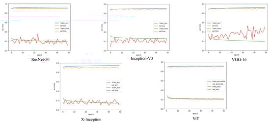 The patch-level experiment used the Adam optimizer with a learning rate of 0.0002, and the batch size was set to 32. During the training, we used the cross-entropy loss function to optimize the deep learning model []. Figure 4 shows the accuracy and loss curves of the different deep learning models used in this experiment. The epoch was determined based on the convergence of the loss curve. In our pretest, we tried to train 100 epochs and maintained the best training model weights, and found that the best model appeared between 40 and 50, where too much training caused overfitting and too little training was not able to train the optimal model. Therefore, considering the computational performance of the workstation, we finally set 50 epochs for training. Deep neural networks have a strong expressive ability compared to traditional models that require more data to avoid overfitting. Because our experiment was conducted on a small dataset, we employed a transfer learning approach to avoid the overfitting problem []. Meanwhile, because of the outstanding classification ability of CNN in ImageNet and the significant performance of transfer learning with a limited training data set [], we used the limited EM training data to fine-tune the CNN model pretrained by ImageNet [,]. It has been proven that using CNN pretrained on ImageNet is useful for classification tasks through the concept of transfer learning and fine-tuning []. Before fine-tuning the pretrained CNN, we froze the parameters of the pretrained model. Subsequently, we used patch-level data to fine-tune the dense layers of the CNN. We retained the backbone network of the CNN classification network to extract image features and replace the last fully connected layer of the CNN model with Global Average Pooling2D + dense + dense + SoftMax. Global average Pooling2D simplifies many parameter operations. The purpose of the dense layer is to extract the correlation between these features through nonlinear changes in the dense layer and map them to the output space. Finally, the class probability result was outputted using SoftMax. We also compared the validation set accuracy of the ViT model with and without pre-trained weights. In both sets of experiments, we trained three times and then averaged the results. We found that ViT without pretrained weights and ViT with ImageNet pretrained weights had accuracies of 0.8923 and 0.8926 on the validation set, respectively. During training, ViT takes approximately 2G less memory for loading than the ImageNet pretrained weight model. To compare the performance of the two methods, we used ViT without pretraining as the optimization option. We set the network depth to six, heads to 16, mlp_dim to 3000, and dropout and emb_dropout to 0.1. The pixel-level experiment used the Adam optimizer with a learning rate of 0.001, and the batch size was set to 4. Figure 5 shows the loss curves of the different deep learning models in this experiment. The training curves began to converge after 90 epochs of iterations for the five models. To prevent overfitting, we set 100 epochs for training.