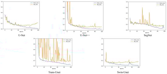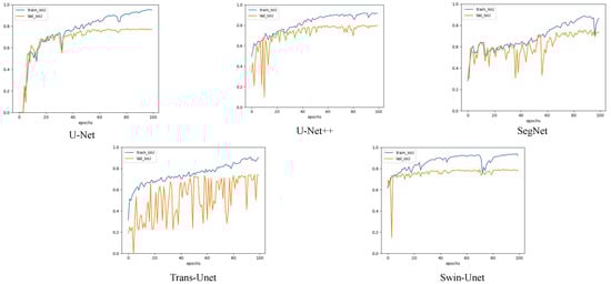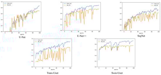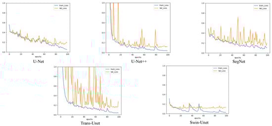 In the pixel-level segmentation experiment, we also conducted a comparative experiment between the CNN and ViT models. The model with the highest segmentation performance was U-Net++ []. Similarly, the Swin-UNet model [], represented by the ViT model, had a better convergence speed than the CNN model. In addition, the accuracy of the Swin-UNet segmentation was better than that of U-Net, SegNet [], and Trans-Unet [].