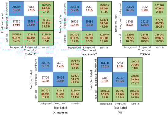To compare the classification performance of the CNNs and ViT models, we calculated the precision, recall, F1-Score, and maximum accuracy to evaluate the models. The segmentation results of the pixel patches in the validation set are presented in Table 4. Overall, the Pre of the deep learning network that classifies the transparent image background was higher than that of the foreground image. In addition, the Pre of the five models for classifying transparent image backgrounds was approximately 97%; the highest was the VGG-16 value of 97.6%, and the lowest was the Xception and ViT value of 96.7%. The Pre rate of foreground classification VGG-16 was the best, and the Pre rate was 63.1%. Inception-V3 showed the lowest value (53.3%). For transparent image foreground classification, the highest Rec rate was obtained with Xception (89.2%), and the lowest was ViT (84.1%). For transparent image background classification, the highest Rec rate was the ViT value of 90.3%, and the lowest was the Xception value of 85.0%. The Spe obtained by the five models in the classification background was opposite to the Rec rate obtained in the classification foreground. Among the five models, the highest Acc was ResNet50 with 92.87%, and the lowest was ViT with 89.26%.