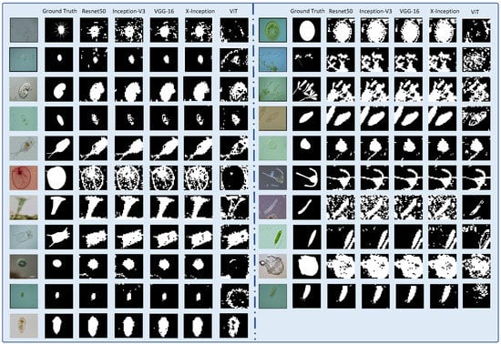 In the predicted 215,040 patches, we compared the performance of five types of network classification: foreground and background. From Figure 6, Inception-V3 has the largest number of correct foregrounds under pixel patches, whereas ResNet50 has the largest number of correctly classified backgrounds. Furthermore, ViT network models misclassified foreground patches more than CNNs models. Consequently, the number of correctly classified foregrounds in the CNNs network was greater than that in the ViT network. Moreover, the ability of Swin-UNet to segment the foreground outperformed most models. Therefore, the ViT model was found as outstanding for low-transparency image recognition. Furthermore, in [,,], on other datasets, the classification performance of the CNN model was better than that of the ViT network, and the training time of the ViT network model was less than that of the CNN model.