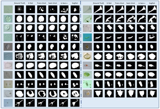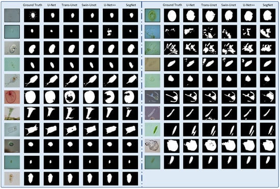 To compare the effect of path-level segmentation, we conducted extended experiments using pixel-level segmentation. We applied five networks for the comparative experiments: U-Net, U-Net++, SegNet, TransUnet, and Swin-UNet. We used these five networks to compare the performance of the CNN and ViT for pixel-level segmentation. U-Net, U-Net++, and SegNet stand for CNN network, Swin-UNet stands for transformer networks, and TransUnet stands for CNNs joining the transformer. Table 6 presents the outcome of the five model prediction metrics. We found that U-Net++ exhibited the highest segmentation performance overall, but also had the longest training time. U-Net exhibited the worst segmentation performance. The segmentation result of the vision transformer network (Swin-UNet) was second after that of U-Net++. The Jaccard and precision values were 71.26% and 85.00%, respectively, which were higher than those of the other network models. To compare the segmentation results more intuitively, we presented the pixel-level segmentation results in Figure 8. Clearly, the pixel-level segmentation results are better than those of the patch level. However, the patch-level segmentation effect was better for multiobject transparent microorganism images. Compared to the patch-level segmentation, the network model with a transformer structure (Swin-UNet) at the pixel level performed well, and the ViT was higher than the accuracy of the CNN model. However, in the patch-level experiment, the accuracy of the CNN was higher than that of ViT. It is shown in Figure 5 that the loss curve stability of Swin-UNet is significantly better than that of the other four models during training. The training loss stability of the ViT model was better than that of the CNN model. To reflect the training process of the model more intuitively, the Intersection-over-Union (IOU) curves of the five models on the training and validation sets in the pixel-level experiment is presented in Figure 9.