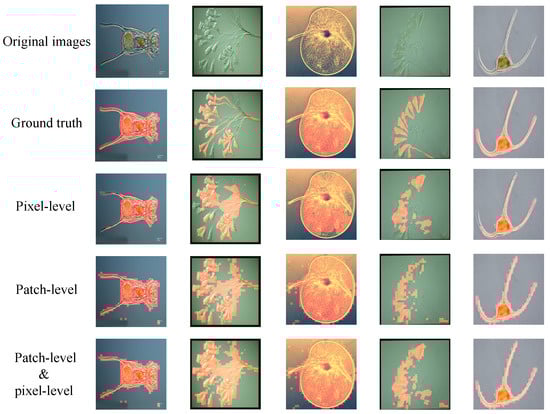 We found that the segmentation effect of the pixel level was higher than that of the patch level, but the segmentation result of the patch level can compensate for the loss of details of pixel-level segmentation. Therefore, we combined the patch-level and pixel-level segmentation results to obtain the optimal segmentation results. Figure 14 compares the GT, pixel-level, patch-level, and combined segmentation results. We set the segmentation region to a red mask and found that the combined results were significantly better than the single pixel-level or patch-level segmentation results.