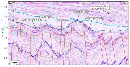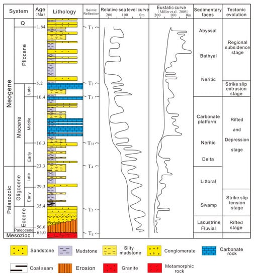 All seismic interpretations were completed in the Geoframe4.5 software launched by Schlumberger. Seven sequence interfaces were interpreted from bottom to top, Tg (~56.6 Ma), T6 (35.4 Ma), T5 (23.3 Ma), T4 (16.3 Ma), T3 (10.4 Ma), T2 (5.2 Ma), T1 (1.6 Ma) in Figure 3 [23]. The identification and spatial and temporal distribution of the RCPs were mainly completed by interpreting seismic data and analyzing drilling data. In the main tectonic units, the pseudo-wells were extracted through the common central point trace set of seismic data, and the tectonic subsidence history of the carbonate platform development area was analyzed. The estimation of water depth is mainly based on sedimentary facies and micro-body paleontology information in drilling and on drawing tectonic subsidence curves.