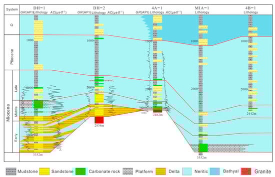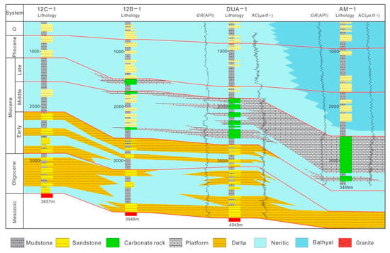 Based on nine wells drilled in the basin, the sedimentary characteristics of carbonate rocks in each time slice of Wan’an Basin were analyzed in detail through parallel well comparison, and the lithologic assemblage characteristics in different regions in combination with logging information were identified. The findings show that during the Early Miocene, the western part of the Wan’an Basin was dominated by delta deposits in in Figure 4 and Figure 5, with interbedded sand–shale deposits in lithology. In the middle and east of the basin, it was the sand and mudstone deposits in the shore–shallow sea. Well Mia-1 in the north of the basin reveals that carbonate deposits existed in this period but on a small scale and scattered on the periphery of the delta.