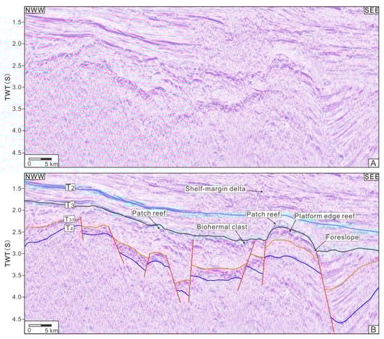 In addition, these high-angle normal faults also determine that the slope at the edge of the carbonate platform is dominated by steep slopes in Figure 6 and Figure 7. Since the Early Miocene, the faulting activity in the basin has basically stopped, and the subsequent relatively slow tectonic subsidence provided stable favorable conditions for the mass development of RCPs. In the early Middle Miocene, although the expansion of the South China Sea had ceased, the Nansha block continued to move southeastward and collided with the Borneo block, resulting in the compression of the southern part of the South China Sea and forming an important Wan’an Movement in the Nansha Sea area [20,21]. The compressed movement reached its maximum at the end of the Middle Miocene and caused the overall uplift of the sedimentary strata in the Nansha Sea area and suffered large-scale denudation.