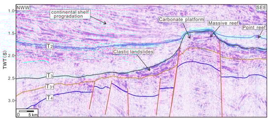 At the foot of the platform slope, clastic landslides with strong reflections and cluttered seismic structures are deposited, and there is a clear overshoot at the edge of the platform. The deposition thickness decreased with distance away from the edge of the platform in Figure 7, indicating that the transport capacity of carbonate debris decreased with distance. The carbonate platform in the southern part of the basin has obvious east-west zoning, and these platforms on both sides are developed on the fault block in Figure 8. Due to the growth of reefs on the east side of the platform, both sides of the platform are higher than the topography of the platform, and it is easy to form a lagoon inside the platform. The continuous reflection of strong and weak phases is typical of lagoon deposition, but the lagoon is small in size, as shown in Figure 9. There is an obvious unconformity interface between the strong reflection carbonate platform and the weak reflection overlying layer (T3), which indicates that the development of the carbonate platform above this interface has entered another phase. The spatial extension of these isolated platforms is limited by faults and the width is only about 5–20 km. The thickness of the platform increases gradually from west to east, and the maximum thickness in the east is more than 1000 m in Figure 5 and Figure 7.