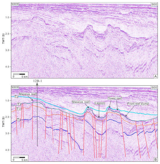 Massive reefs: The shape of the reef is blocky, with continuous strong reflection at the top, one or more continuous in-phase axes visible inside and weak reflection at the bottom, as shown in Figure 7, Figure 8 and Figure 9. They mainly developed on the top of a relatively narrow platform and distributed in the central and southern parts of the basin, and the thickness of the reef has certain differences. Drilling well 12B-1 reveals that the thickness of the massive reef in the south is about 100 m in Figure 5 and Figure 9, and the thickness of the massive reef in the central part of the basin is more than 500 m. The landslide reflection of reef edge is strong, but the continuity is poor.