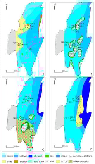 During this period, under the influence of continental shelf progradation in Figure 6, Figure 7 and Figure 8 the water body in the Wan’an Basin gradually deepened from west to east. The sedimentary facies consisted of shallow-sea shelf sand and mudstone deposits, shallow-semi-deep ocean shelf margin mudstones and semi-deep ocean slopes [29] in Figure 10D. The central and western regions of the basin are almost under the control of continental shelf progradation, and the input of a large amount of terrigenous clasts is not beneficial to the growth and development of RCPs, while the abyssal and semi-abyssal environment in the eastern part of the basin is also not conducive to the development of carbonate platforms. In short, since the Pliocene, there are no more RCPs in the Wan’an Basin. Therefore, this work no longer describes the sedimentary facies of this period.