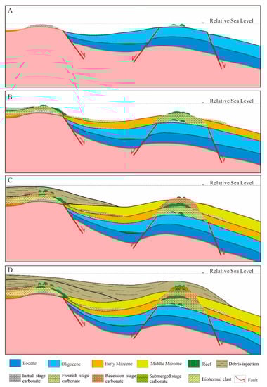 The cyclic growth of RCPs is closely related to the third-order relative sea level fluctuation in Southeast Asia and the Maldives [27,30]. In general, RCP growth is mainly vertical with the rapid rise of relative sea level. When the relative sea level falls, the accumulation of RCPs is mainly lateral. The tectonic activity of the Wan’an Basin began to weaken in the early Miocene, and the relative sea level became stable in Figure 3, which was conducive to the initial development of RCPs.
