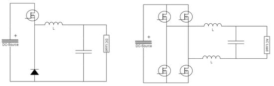 Classical Buck-derived converter topologies. (Left) a buck chopper and (right) a voltage source inverter.