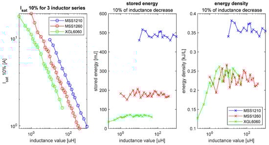 The three series pictured in Figure 2 are mapping a wide range of high-frequency inductor values and current saturation as illustrated in the plot in Figure 3. With this set of components, the power electronics designer has in its hands many options to design power converters in the range of a few tens of volts and amps, leading to converters from tens to hundreds of watts. Maximum energy density can be derived with Equations (1) and (2). In the selected series, the volume energy density ranges from 0.2 kJ/L up to 0.35 kJ/L.