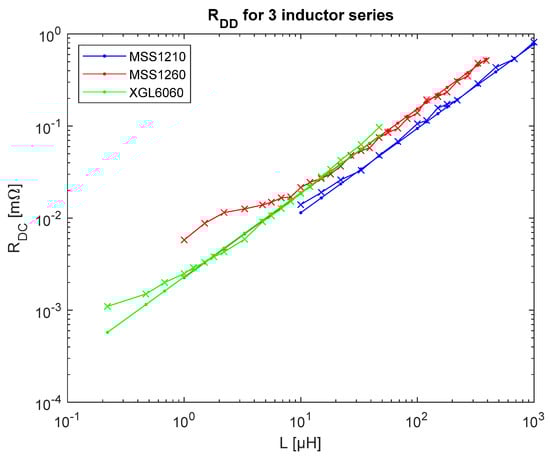 Evolution of the series resistance of the inductors with respect to inductor value for the three studied inductor series [,,]. Also linearized curves for each inductor series with respect to inductor value.