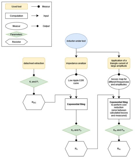 The simplest model to represent magnetic component losses is based on the addition of a series resistance with the inductor. Well parametrized, this series resistance is able to represent the losses in the inductor with respect to the current flowing through the device. In this part, we aim to identify a relationship between the series resistance of the inductor and the inductor value itself. If this generic representation is possible at the inductor scale, it will be possible to use it in the inductor component series. Considering the curves in Figure 4, the value of , can easily be derived with respect to for any device of the three series, applying linear regression. But it is well k-own that this DC resistance is not representative of the actual resistor of the inductor for high-frequency currents. Skin effects as well as proximity effects are affecting the current distribution in the wire, increasing the apparent resistance. Also, core/iron losses are also generated when AC signals are applied to the magnetic devices. In order to account for it, additional characterization must be performed. The goal of the characterization test bench is to record the power losses into the DUT with respect to realistic and/or representative current waveforms applied to it. To do this, several characterization steps are considered. A first option can be to measure the frequency dependence of the inductor resistance with an impedance analyser. A second option can be to measure the actual losses in the inductor, applying a variable ripple current over a wide frequency range and magnitude, more representative of the actual large signals usually applied to the DUT while implemented in PE converters. The following parts are investigating these two techniques, showing that the first one is not sufficient to describe the characteristics of the tested inductor. It is shown that the most accurate approach to characterize and model the inductor losses is based on a combination of the two methods. Figure 5 presents the characterization and modelling approach used to determine the mathematical model and parameters of the inductor losses. The characteristic factors: are going to be presented in the following parts.