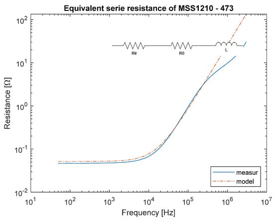 A first characterization is made with an impedance analyser (Keysight E4990A + Keysight 16047E from Keysight, Santa Rosa, CA, USA). A first frequency-dependent characteristic of the equivalent series resistance is obtained and depicted in Figure 6. Since the characterization method with the impedance analyser is based on applying low-magnitude HF currents, the obtained characteristic for the equivalent series resistance accounts mainly for the winding resistance. The evolution of the series resistance of the characterized inductor with respect to the frequency is representative of the skin effects as well as the proximity effects in the wire. If the skin effect is to be the major part of the frequency-dependent resistor, this resistance is expected to evolve with the square root of the switching frequency, as explained chapter 5.2 of []. As it can be seen in Figure 6, the evolution of the series resistance appears not to be proportional to the square root of the frequency as it would be the case if only skin effects were taken into account. This difference highlights the difficulty to rely only on theoretical models to represent the behaviour of the inductor resistance accurately with respect to the frequency. From this characterization, an equivalent inductor value and frequency dependent resistor model can be derived by fitting the two parameters in Equation (4). In these parameters, “” accounts for “a low ripple” current. This fit can be made by applying common exponential regression on the second part of the curve. For the characterized inductor, the values for parameters are respectively 210 and 1.5. As the principal factor frequency dependence in inductors are skin effect and core losses, evolving respectively with the square root of the frequency [,] and a power factor between one and two [,]. This resistance is a combination of several physical effects with respect to the frequency, it is difficult to represent with theoretical modelling technique without materials and winding knowledge.