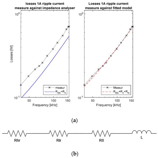 In Figure 8a below, the blue curve with cross presents on the left the evolution of the measured losses inside the inductor for a 1A ripple current over a frequency range from 50 kHz to 150 kHz. In the same plot, the red curve with dots represents the losses estimated with the equivalent series resistance obtained from the previous characterization method. As it can be seen in Figure 8a, taking into account the measured equivalent series resistance from Figure 5, it is not possible to derive the same amount of losses dissipated in the inductor while performing the characterization test depicted in Figure 7. Indeed, in the left of Figure 8 it appears that the inductor losses are significantly underestimated with the model derived from the impedance analyser characterization. To take into account the extra AC losses produced by the high ripple current with respect to the frequency, there is a need to add an additional resistance to the model. For this purpose, the loss curve is fitted by action on the two additional parameters in the Equation (6). The resulting equivalent resistance is set to produce the same amount of losses with respect to the frequency as is it shown in Figure 7, right. The total inductor resistance is now fully described in Equation (7), also illustrated in Figure 8b.
