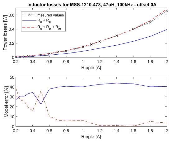 Evolution of losses into an MSS1210-473 47 µH inductor at 100 kHz over a ripple current magnitude from 0.2 up to 2 A. The upper curve represents the losses into the inductor measured and calculated with models of Equation (4) in blue and (6) in red. The bottom curves present the absolute relative errors between the impedance analyser model and the AC loss model.