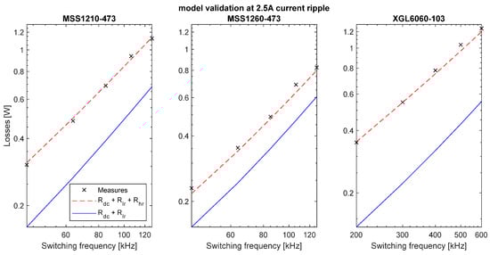 Evolution of the losses produced by three inductors under test. Validation of the + + model.
