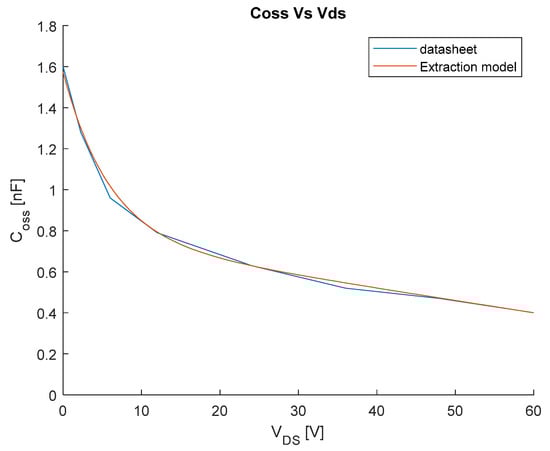 The losses of active components are partially frequency-dependent. These are called switching losses. There are a lot of complex models able to describe switching losses [,,,]. For silicon MOSFET power devices operating under a very fast switching transition, a simple one is to consider the switching losses with respect to the stored energy into parasitic capacitor Coss. Since Coss is a nonlinear capacitor, special care must be paid to estimate the energy stored in the Coss. From MOSFET manufacturer datasheets, one can derive the total energy stored in Coss, using Equation (9). Considering that each time the transistor switches ON, the entire energy stored into Coss is dissipated through the channel of the device [,], then switching losses can be derived thanks to Equation (9) below. This switching loss modelling technique is valid only if the MOSFET is switching very fast. The transistor used to make the test bench being (SIS862DN-T1-GE3), the stored energy in Coss can be extracted from the datasheet according to the curve pasted in Figure 11. Parameters in Equation (12) are derived to fit Coss versus Vds. Transistor gate drivers are also dissipating the loss function of the switching frequency. In the transistor datasheet, the stored charge can be easily derived from tables and abacus. For hard switching operation, both losses must be taken into consideration. For soft switching, only driver losses must be considered.
