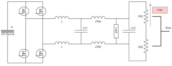 Please note that the LISN total resistor is 100 Ω, the sum of two 50 Ω resistors. However, the probe is inserted across one of the two resistors, justifying the factor 2 in Equation (13) above. Also, in Equations (13) and (14), is the current flowing in the inductors of the chopper.