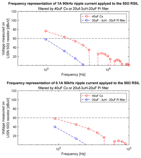 Frequency domain representation of 1A magnitude at 83% duty cycle filtered by a capacitor of 40 µF or by a filter ( = 20 µF, = 3 µH, = 20 µF) to meet the 60 dBµV limits using Equation (15) to calculate the value of .