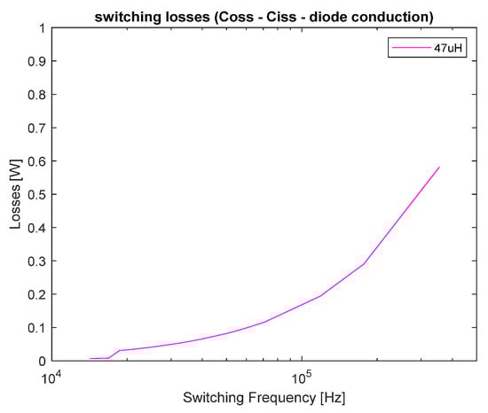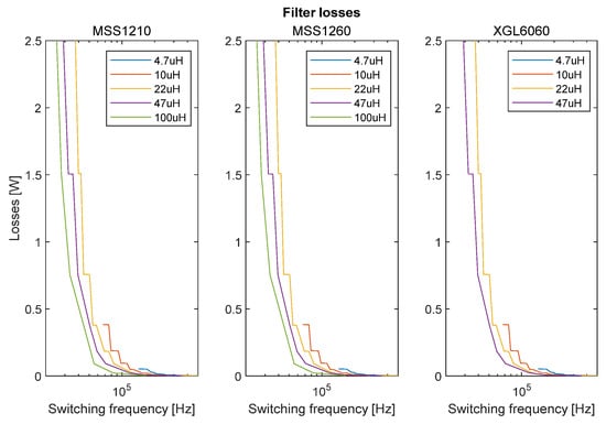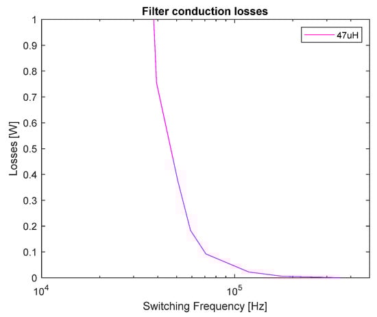 As presented in Section 3.3, the minimum filtering inductor value needed to comply with the 60 dBµV has been calculated for each F-R-Oi value. Losses due to this filter have been calculated accordingly. Thanks to the high quality of ceramic capacitors and their low relative ESR, the prevalent part of the losses in the π filter is due to the part of the filtering inductors’ ESR. The estimated losses inside the filter are presented in Figure 21. The steps on each curve are the result of a decrease in value implying a decrease of . While at the same ripple, the value of the main inductor is low, the frequency is high. This means that the value of the filtering inductor is lower, lowering the global losses. However, for an iso-frequency, the lower the main inductor value is, the higher the value for the filter inductor.