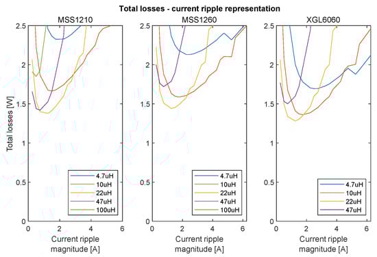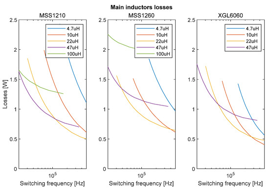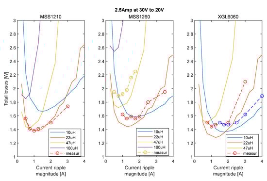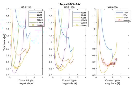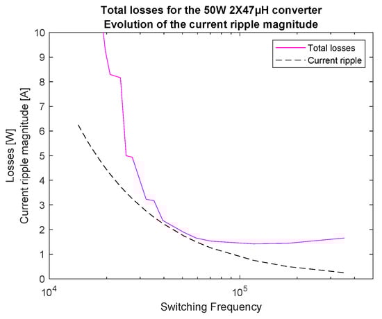 Although the different series have different volumes, it is interesting to note that the losses on the optimum are around the same value for the three inductors series. But the lower the volume is, the lower the optimal inductor value is, and the higher the ripple current is. The optimum can be found around a switching frequency of 100 kHz. Figure 23 presents the same result as the frequency is linked to the ripple current by the inductor value. As the optimum switching frequency is around 100 kHz, the optimum ripple current magnitude is around 1.25 A for an average current of 2.5A. Therefore, the optimal ripple current magnitude seems to be located at about 50% of the average current in this particular design case study. This is significantly higher than what the power electronic design engineer considers, usually more in the range of 10 to 25%. It is even above the standard recommendation of 20 to 40% proposed by manufacturers as in [,,]. With these considerations, for each series, an optimal working point has been found with a pair of 22 µH inductors and losses extracted in Table 4.