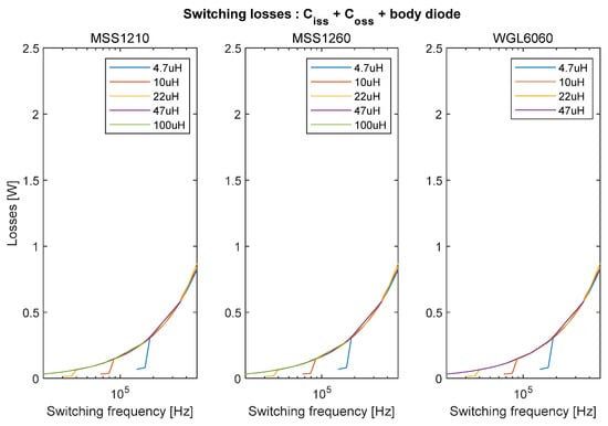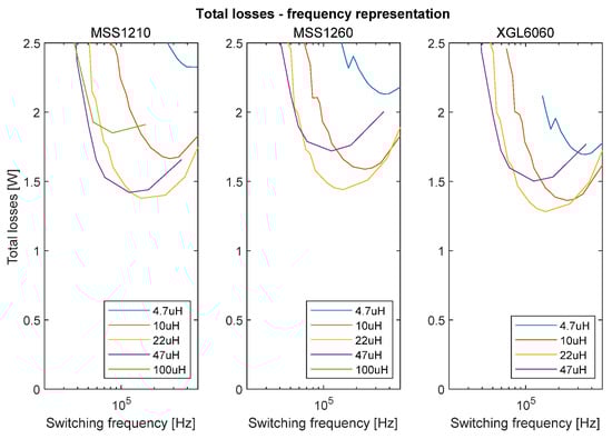 Total mosses modelling results for the three inductor families. Total losses are represented as a function of the switching frequency and the inductor values.