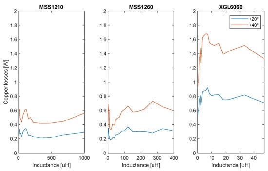 Maximum losses allowed in the inductor for various inductor values and for two temperature rises. Data extracted from datasheets [,,].