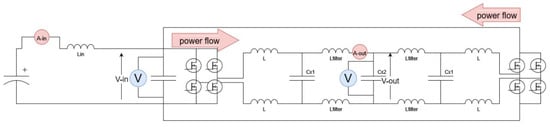 As mentioned above, a clear design frame must be defined in order to take into account the impact of frequency and inductor ripple magnitude on conducted EMI. For this purpose, it is defined that the output ripple current going out from the converter must not exceed some limits. Taking into consideration conducted EMI regulations [,], in a tentative to make it clear and simple to use in the inductor value selection process, it has been defined that the current harmonics are going out of the power converter, flowing into the two 50Ω resistors of a conducted EMI testing equipment, should not exceed 60 dBµV no matter the frequency considered. These choices are slightly different from the regulations. Nonetheless, they are offering a realistic reference that eases the design and optimization process. Figure 12 below presents the schematic of a typical differential mode (DM) input filter circuit inserted between the converter itself and the LISN (Line Impedance Stabilization Network) testing equipment considered for conducted EMI compliance.