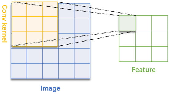 A convolutional neural network (CNN) is a multilayer supervised feedforward neural network designed to learn abstract features of the input by alternately stacking convolutional kernels and pooling operations. CNNs are characterized by weight sharing and sparse connectivity and generally consist of a convolutional layer, a pooling layer, and a fully connected layer. The convolutional layer consists of multiple convolutional units that perform different operations by adjusting parameters through a backpropagation algorithm [24]. The convolutional layer is used to extract the feature map using a convolutional kernel. The convolution kernel can be considered as the matrix. For example, a convolution kernel is set up as a 3 × 3 matrix and the size of the image to be convolved is 5 × 5. The convolution kernel will perform a convolution operation on the first area of the image to be convolved, and the result of this convolution calculation will be used as a point on the output feature map, as shown in Figure 1. Then, the convolution kernel will slide over the input image and perform the next convolution operation to output the next point on the feature map. The above operations are repeated until the complete feature map is output.