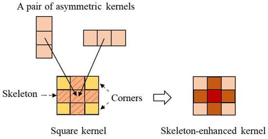 In the literature [26], it was mentioned that the skeleton weights of a convolution kernel are usually large and removing these weights can lead to more accuracy degradation than removing the weights in the corners. In other words, the distribution of the learned feature information by the square convolutional kernels is uneven. Therefore, a pair of asymmetric kernels can be added to the corresponding positions of the matched square convolutional kernels for reinforcing the skeleton information as shown in Figure 4. Moreover, it can be concluded from Equation (4) that the square convolutional kernels with reinforced skeleton add no extra computational effort to the network model.