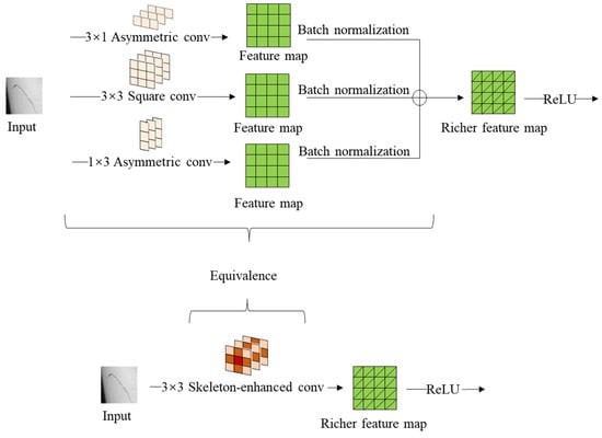 In the convolution operation, the main feature information located at the location of the convolution kernel skeleton is emphasized. This design permits fusing the additional feature information extracted by the asymmetric convolutional layers during the training phase of the network without incurring any additional computational effort during the deployment phase. This improves the network’s performance when inference is implemented.