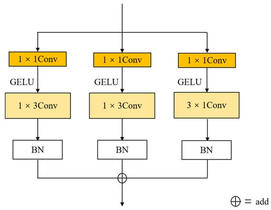 In this paper, the Enhanced Asymmetric Convolution Block (EAC Block) is constructed based on AC Block. The internal structure of the EAC Block is shown in Figure 6. The EAC Block adds a convolution layer with a convolution kernel size of 1 to each branch and then goes through the smooth-labeled GELU activation function, which further enhances the nonlinearity of the module and enhances its expressiveness.