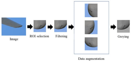 In this study, we collected 306 images of wind turbine blade in JPG format and 921 s of video data in MOV format from a wind farm using a UAV. After splitting the video data into image data, there are 4396 images in total. The input image size required by ED Net is 56 × 56 pixels, while the image size captured by the UAV is 5472 × 3684 pixels. The captured images are larger in pixels and can be appropriately cropped using OpenCV. When the captured images are not cropped to meet the requirements or have no major features, they can then be appropriately modified manually and cropped to a small 56 × 56 image to meet the input requirements of the network. Then, we performed data augmentation on the dataset by adding random noise, image flipping, and clockwise rotation to the damaged images using OpenCV. After data augmentation, the entire dataset had 2648 images. Lastly, since the color of the image in this experiment has little impact on the identification of damage types, the dataset can be grayed to preserve the gradient, reduce the number of calculations, and accelerate the training speed. The pre-process is shown in Figure 8.