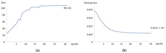 Cross entropy improved by label smoothing is used as the loss function during the training of the ED Net model. Adam gradient descent optimizer with good performance is used for optimization, attenuation rate = 0.9, = 0.999 [30], the batch size is set to 32, and the learning rate attenuation strategy with fixed step size is implemented. The initial learning rate is set to 0.001, and it is decreased to 0.6 times the current rate after every 10 epochs. As shown in Figure 10, a total of 30 epochs are trained, and each epoch is trained to record the accuracy and degree of loss of the current model.