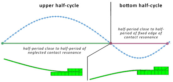 The closer look at the response of the vibration in the resonance verified by non-linear dynamics shows that a full vibration cycle is built out of the lower half-cycle part (while the contact is closed) and the upper half-cycle part (while the contact is open). The lower half-cycle frequency is close to the frequency calculated by modal analysis with a fixed edge of the contact, while the upper half-cycle resonance frequency is equal to the one calculated by modal analysis with neglected contact.