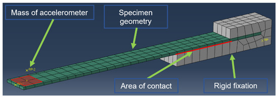 The simulation was following the tip of the specimen, where the accelerometer mass point was attached, and had an enforced displacement of 20 mm in the first step. The second step of the simulation was to release the enforced displacement. The specimen then started to vibrate at natural frequencies. The displacement of the accelerometer point in time was recorded. For the described simulation, Abaqus 2018 was used, with a nonlinear implicit dynamics algorithm, taking into account the contact and geometrical nonlinearity. The CFRP specimen was modelled with Continuum Shell-layered elements, and the accelerometer was modelled as single node mass, connected to the specimen with rigid elements. In addition, the fixation was modelled with discrete rigid elements. For contact, the definition penalization algorithm was used with a friction coefficient of value f = 0.2. To analyze the resonance frequency of the system, a Python script was created to apply a fast Fourier transform on the displacement- time characteristic.