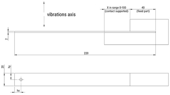 Additionally, for the experimental tests a hole in the free end of the specimen was introduced to attach additional mass as a parameter. The two masses that were included to change the resonance frequency of the system were 7.6 g and 9.7 g.