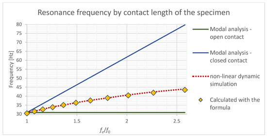 Figure 4. Additionally, the resonance frequencies calculated with the classical modal analysis with fixed contact edge and opened contact were included to visualize the difference.