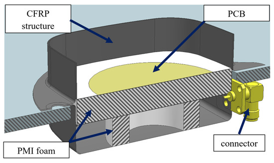 The numerical model for the modal analysis of the antenna was prepared with layered shell elements for CFRP panels and solid elements for foam parts. The shell and solid elements were glued together in the interface areas. The electrical connector was modeled as a mass point attached to its fixation points in the CFRP panel. The mechanical properties of the materials are presented in